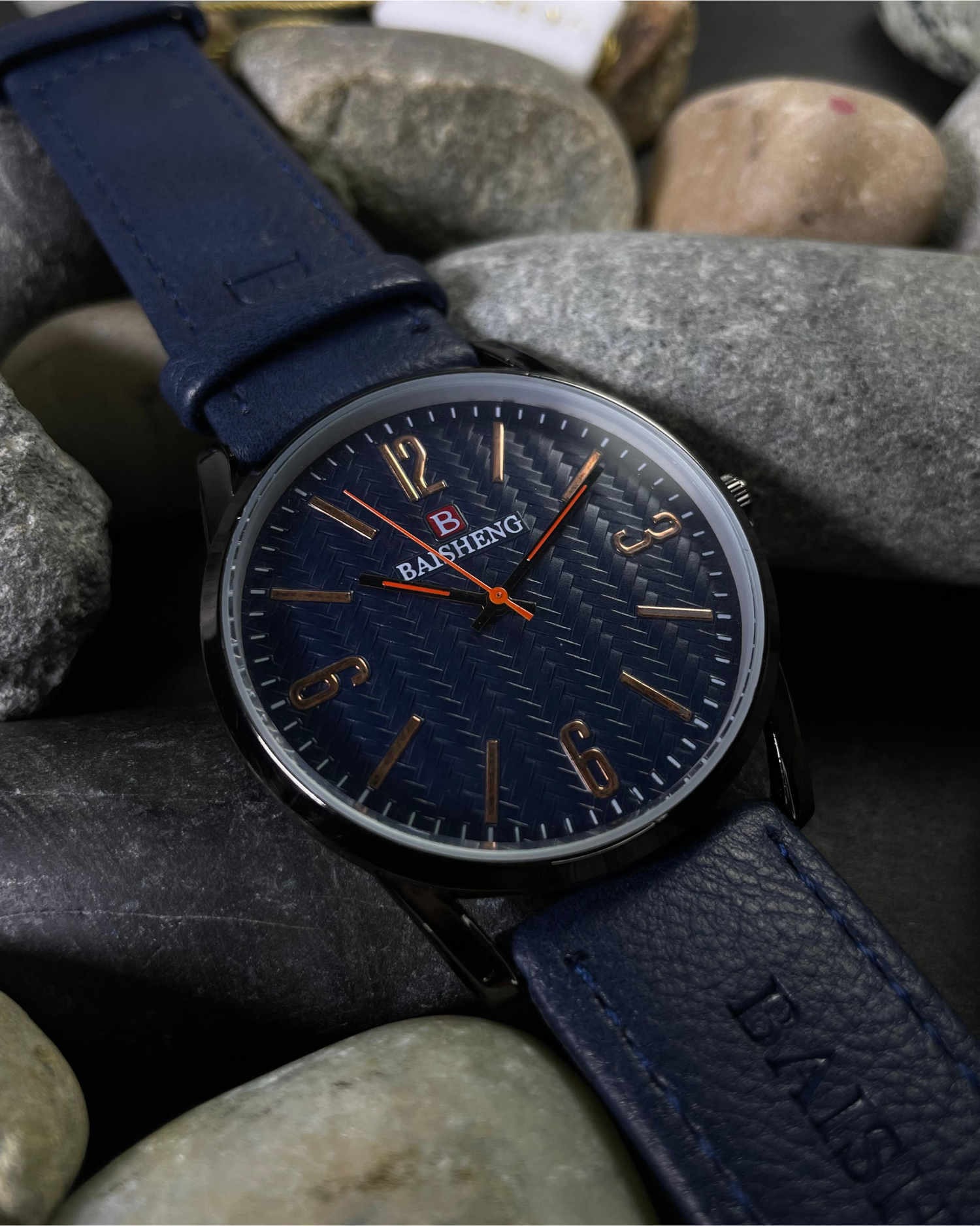 BAISHENG Classic Blue Watch – Textured Dial with Leather Strap